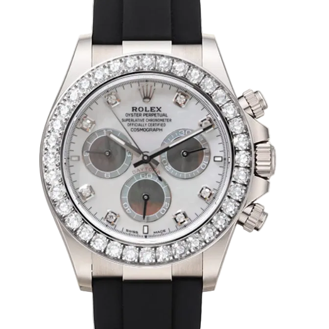 The Rolex Cosmograph Daytona in white gold represents the pinnacle of chronograph engineering. This iconic timepiece features a pristine Oyster case crafted from 18k white gold, paired with a refined dial enhanced by diamond hour markers that catch light with exceptional brilliance. The legendary chronograph movement delivers precise timing across three subdials, while the tachymetric scale enables speed calculations. The Oyster bracelet combines comfort with durability, secured by the robust Oysterlock clasp. Water-resistant to 100 meters, this professional-grade instrument balances haute horlogerie craftsmanship with practical functionality, making it equally suited for the boardroom or the track.