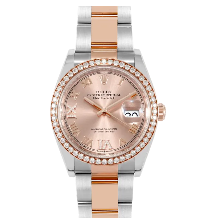The Rolex Datejust 36 represents timeless elegance in watchmaking. This 36mm Oyster case combines Oystersteel with warm Everose gold, creating a sophisticated two-tone aesthetic enhanced by diamond settings. The iconic Datejust features the legendary date window at 3 o'clock and the signature Cyclops lens for enhanced readability. Built with Rolex's precision engineering, the Oyster case ensures water resistance and durability, while the self-winding movement guarantees reliable timekeeping. A masterpiece that seamlessly transitions from boardroom to evening occasions, this timepiece embodies luxury and refinement for the discerning collector.