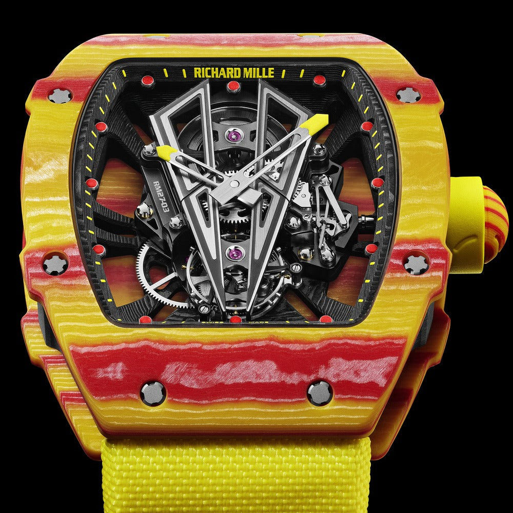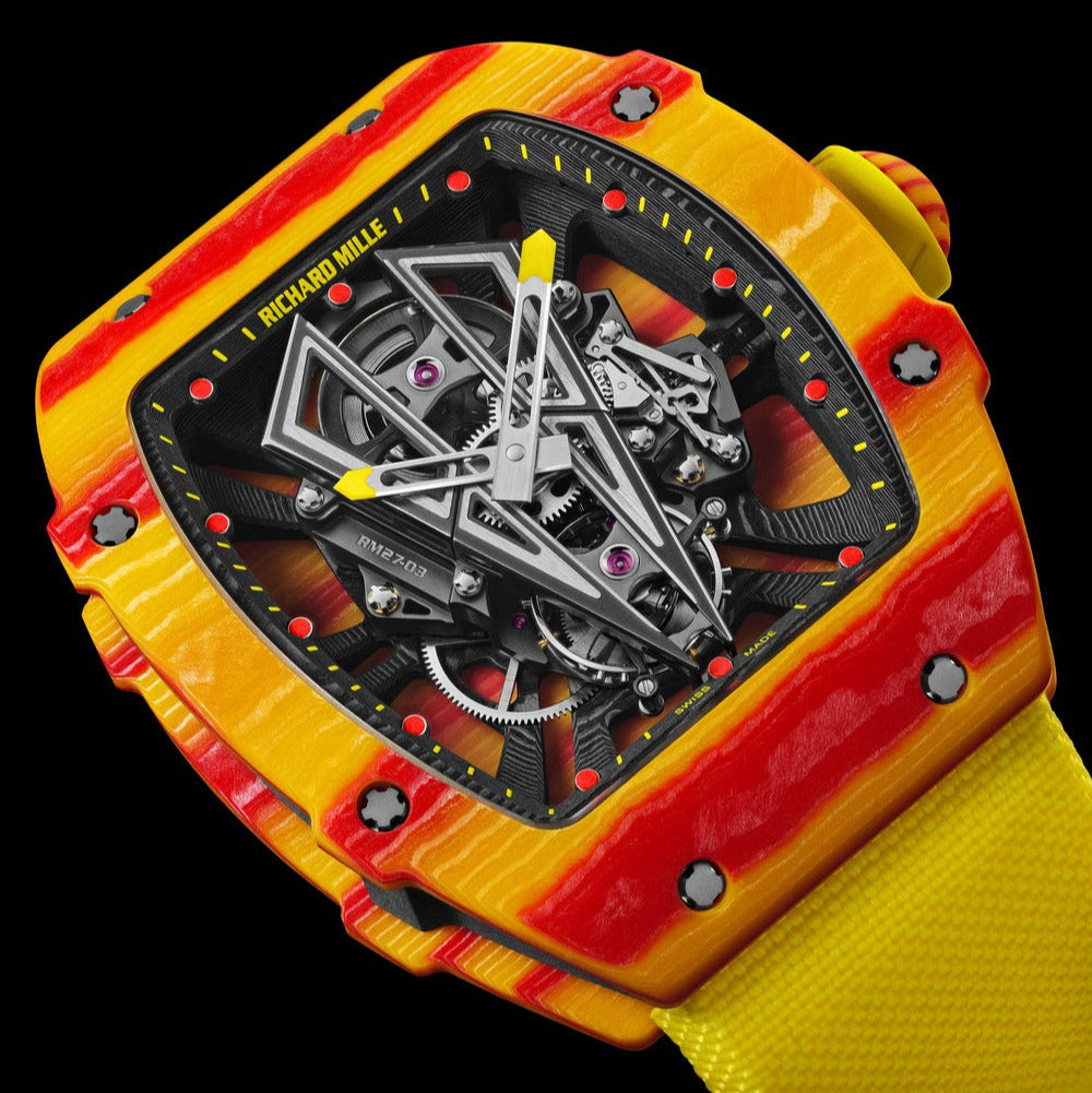 The Richard Mille Rafael Nadal Tourbillon RM27-03 is an exceptional timepiece engineered for elite performance and durability. Crafted with a lightweight yet robust titanium and LITAL® alloy baseplate, it withstands impacts up to 10,000 g’s, perfectly suited for Rafael Nadal’s intense playing style. The skeletonized tourbillon movement showcases advanced horological craftsmanship and offers precision under extreme conditions, making this watch a fusion of groundbreaking technology and luxury design for discerning collectors and sports enthusiasts alike.