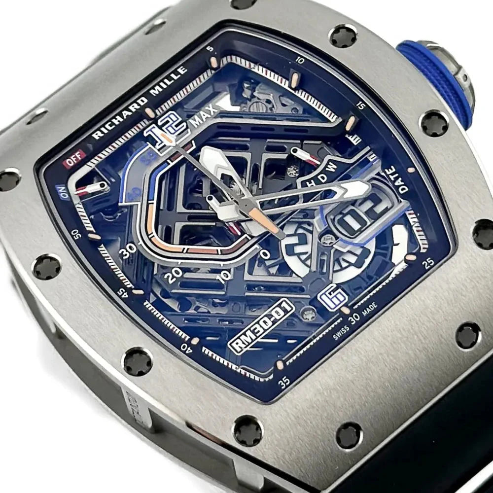 The Richard Mille RM30-01 showcases advanced mechanical engineering through its automatic movement equipped with a declutchable rotor—a refined feature that enables independent manual winding without rotor engagement. This technical innovation minimizes internal friction and extends movement longevity by allowing selective power generation. The caliber demonstrates Richard Mille's mastery of complex watchmaking, delivering superior chronometric performance and reliability. Each component reflects the manufacture's exacting standards and dedication to precision. Ideal for connoisseurs who demand both technical sophistication and horological artistry, this timepiece stands as a testament to contemporary haute horlogerie at its finest.