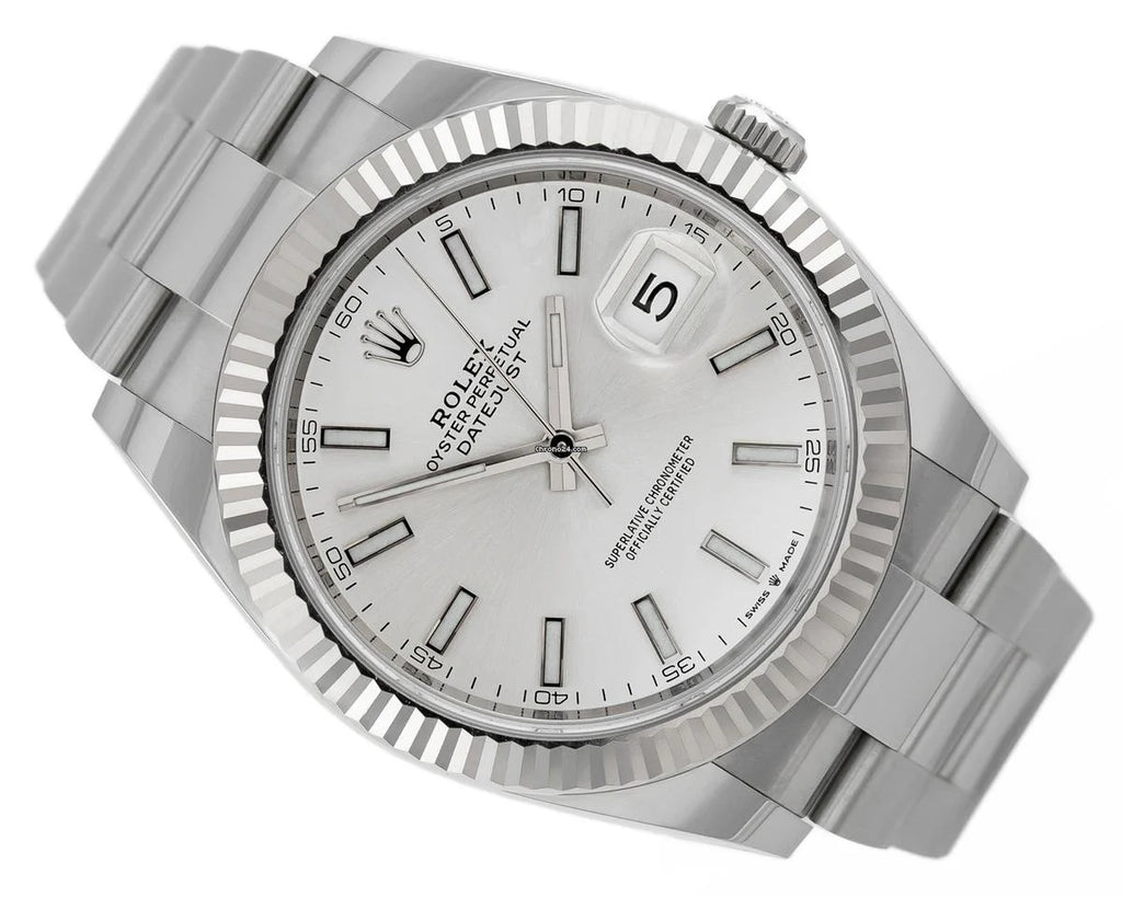 This Rolex Datejust 126334 automatic men's wristwatch offers a sleek and sophisticated design with its silver white gold stainless steel finish. Measuring at 41 mm, this timepiece is perfect for those looking for a larger watch face. The automatic movement ensures accurate timekeeping for any occasion.