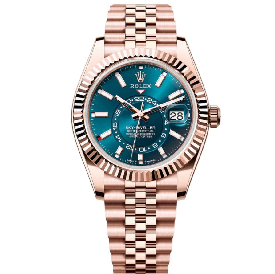 The Rolex Sky-Dweller Oyster in 42 mm Everose gold combines sophisticated design with advanced functionality. Crafted from Rolex’s proprietary Everose gold, this model features a highly legible dial with an innovative dual time zone display and an annual calendar that adjusts automatically. Its robust Oyster case ensures water resistance and durability, while the Ring Command bezel allows intuitive setting of the watch’s functions. This timepiece is engineered for professionals who demand precision, elegance, and practicality in a single luxurious wristwatch.