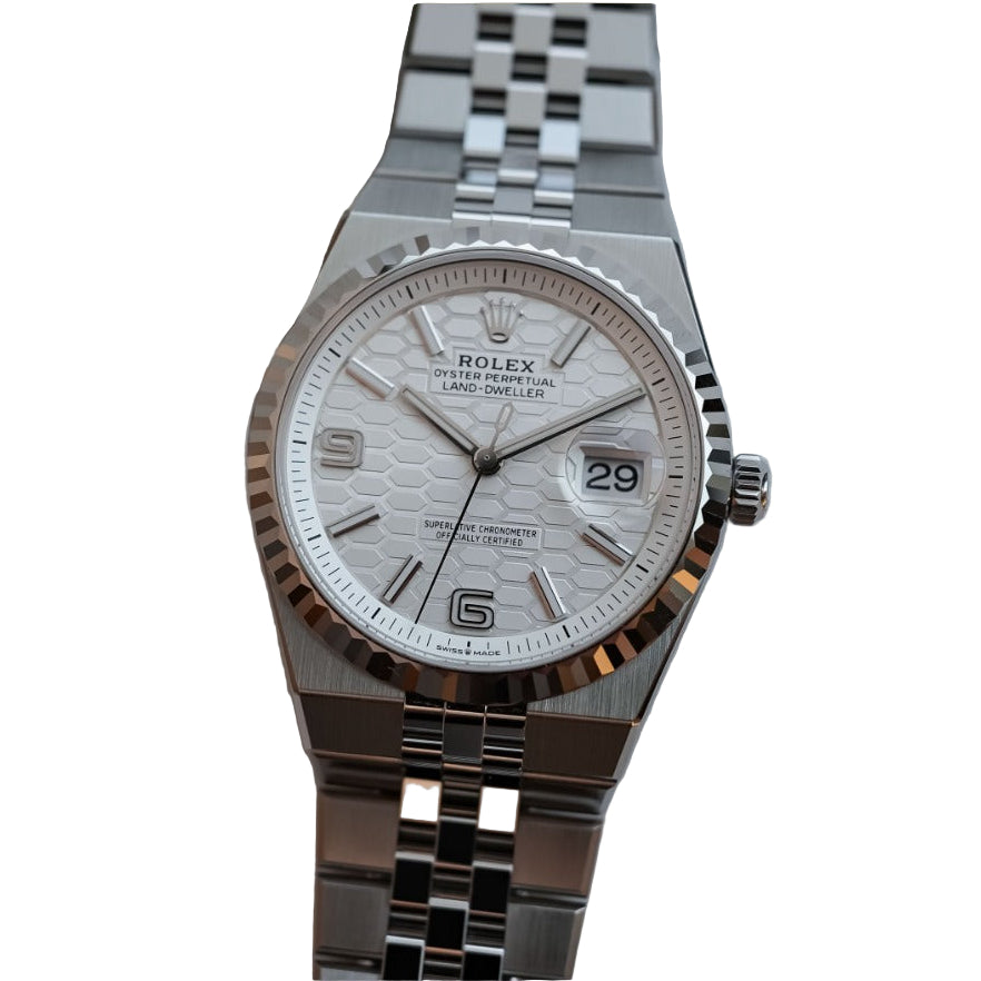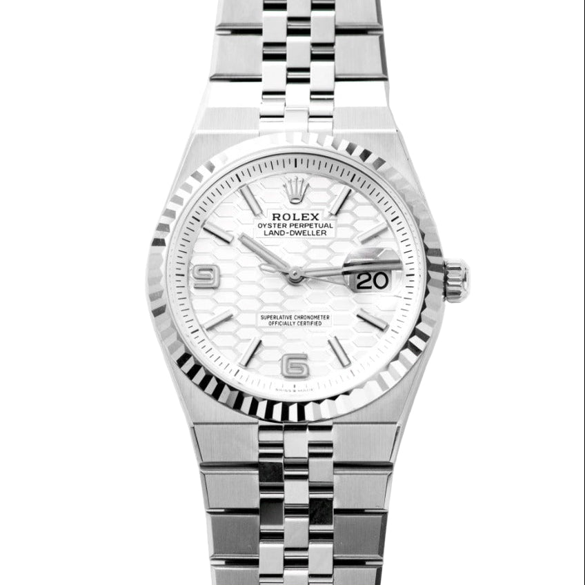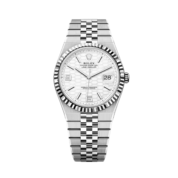 The Rolex Land-Dweller 40 combines robust Oystersteel with elegant white gold in a 40 mm case designed for durability and refined style. Engineered for explorers, its Oyster case ensures water resistance and rugged protection, while the distinctive white gold bezel adds a touch of sophistication. Precision and legibility remain paramount, making this timepiece a reliable companion in challenging environments without compromising luxury.